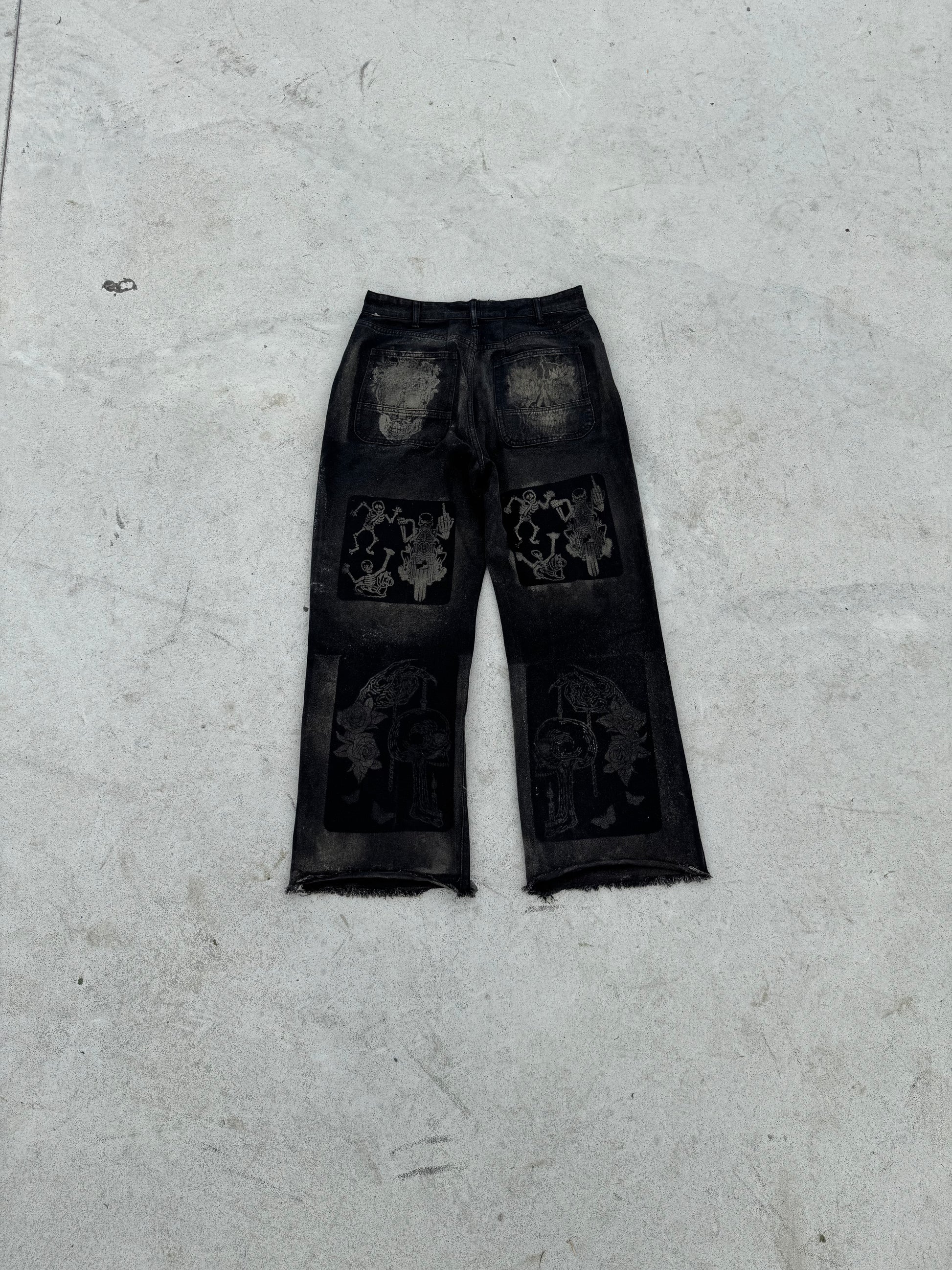 BuyMoor Essential denim jean Street Luxury Edition this is a unique 1 of 1 pair of upcycled denim jeans with decorative patches featuring ornate designs.